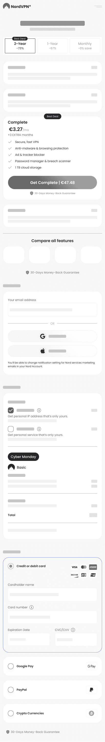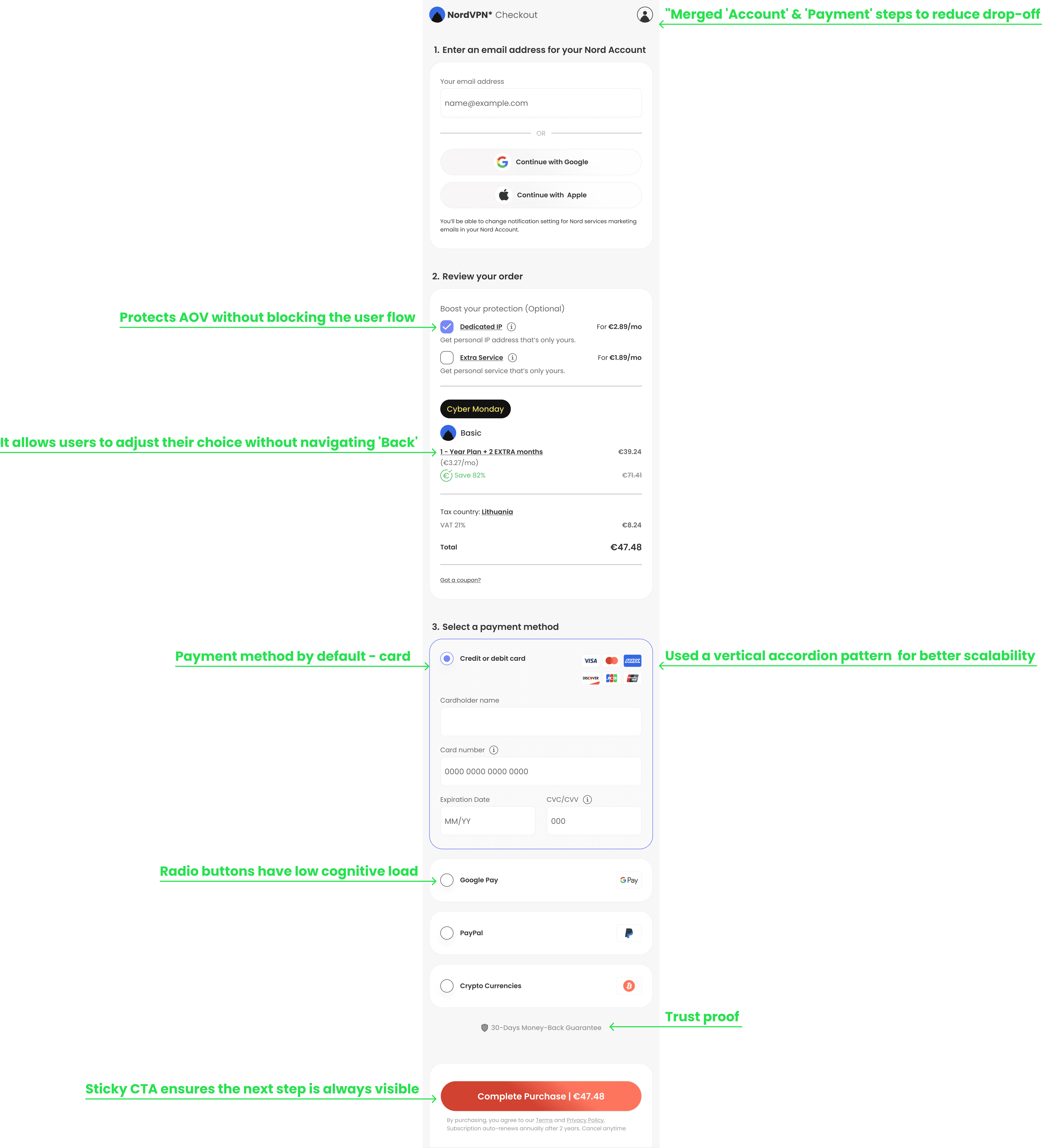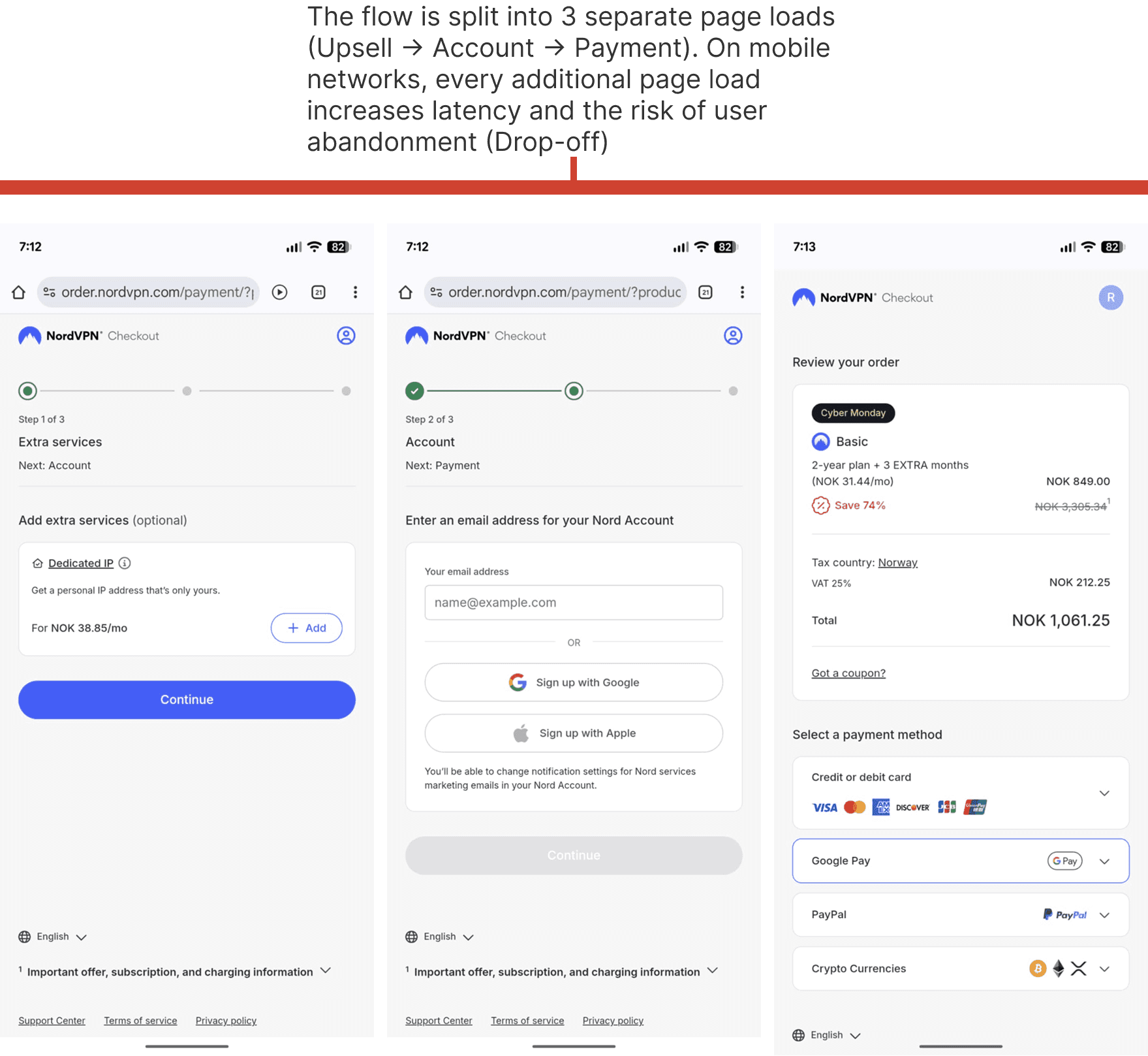 The Context NordVPN is a market leader in cybersecurity, but even top-tier products suffer from cart abandonment. The existing mobile checkout flow was fragmented across multiple screens (Upsell → Account → Payment), creating unnecessary friction points.