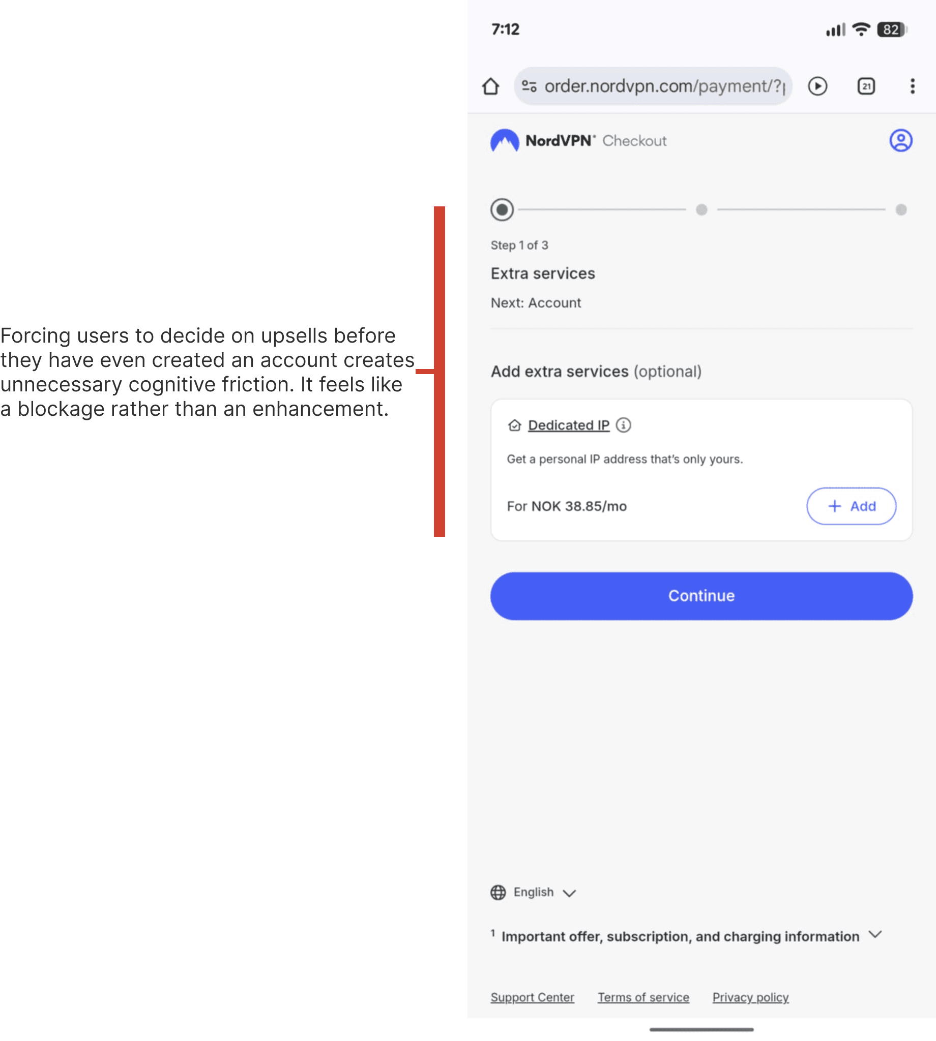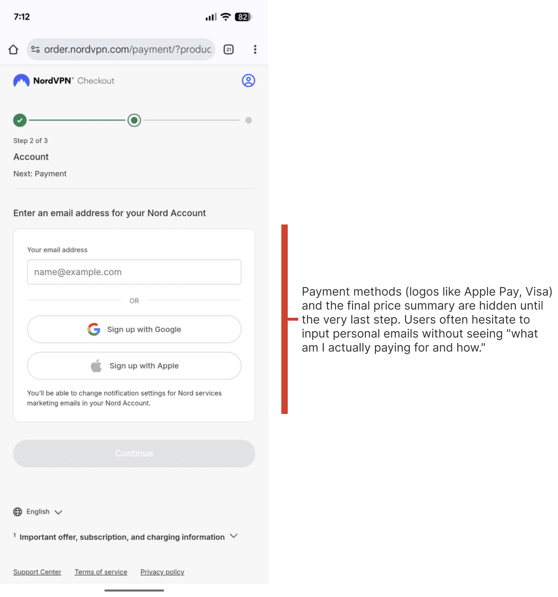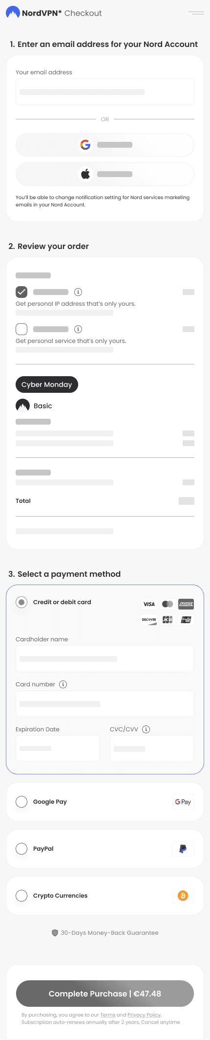 The Context NordVPN is a market leader in cybersecurity, but even top-tier products suffer from cart abandonment. The existing mobile checkout flow was fragmented across multiple screens (Upsell → Account → Payment), creating unnecessary friction points.